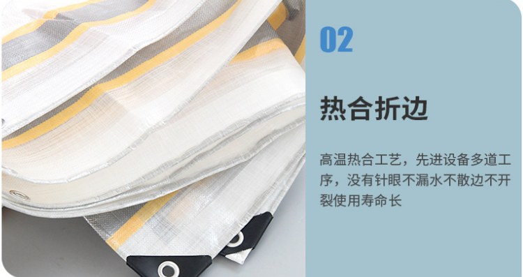 金包銀色PE防水篷布熱合折邊,高溫熱合工藝,先進設備多道工序,沒有針眼不漏水不散邊不開裂使用壽命長。